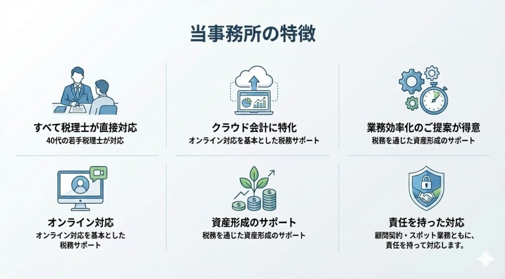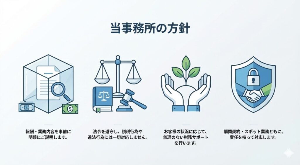 税務は専門性が高く、分かりにくい分野だからこそ、「何を、どこまで、いくらで依頼できるのか」を明確にし、安心してご相談いただける税理士事務所であることを大切にしています。